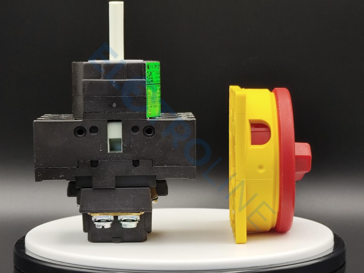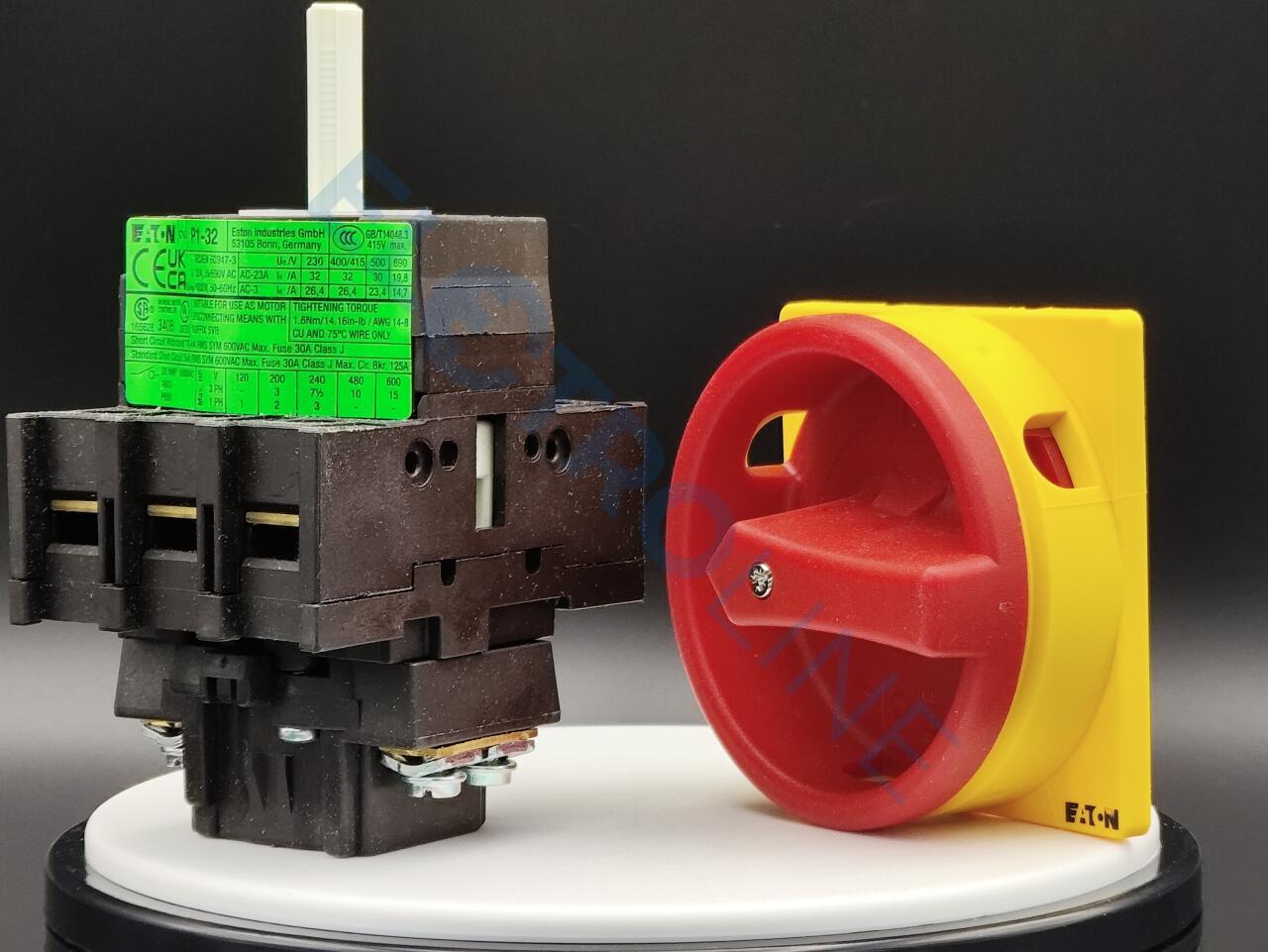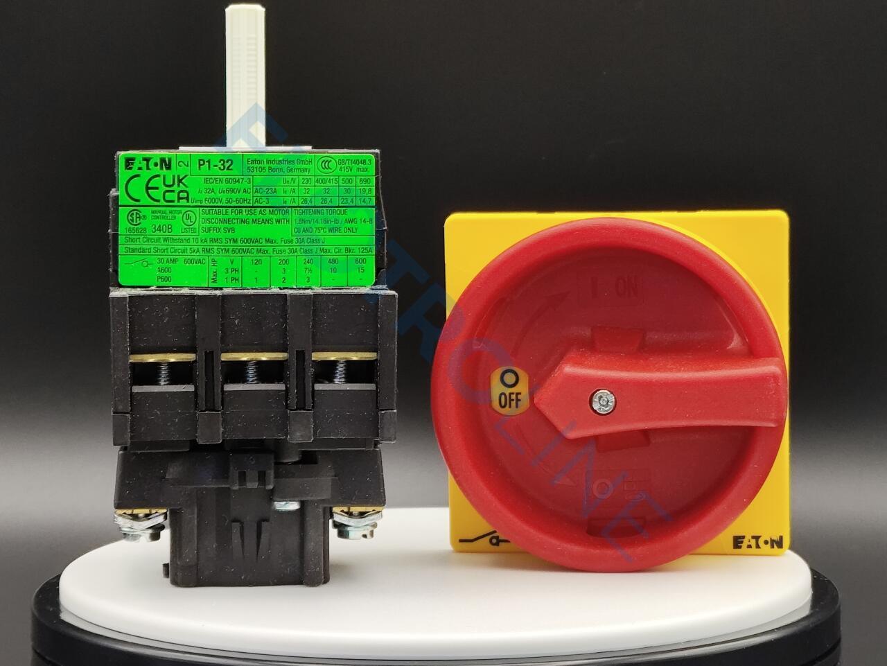 Главный выключатель, Ассортимент: Главные выключатели, Сервисные выключатели, Ремонтные выключатели, Идентификатор типа: P1, Функция останова: Функция аварийного выключения, с красной поворотной ручкой и с желтым храповым венцом, Информация о комплекте поставки: Возможна дополнительная установка вспомогательного контакта или нулевого провода., 3-полюсн., Возможность блокировки: запираемый в положении 0, Класс защиты: спереди IP65, Конструктивное исполнение: Монтаж, Расчетная эксплуатационная мощность AC-23A, 50 - 60 Гц 400 В: P = 15 кВт, измеренный ток длительной нагрузки: Iu = 32 A, Стандарты и предписания: IEC/EN 60947, VDE 0660, IEC/EN 60204, CSA, UL, Силовые разъединители согласно IEC/EN 60947-3, NEMA12