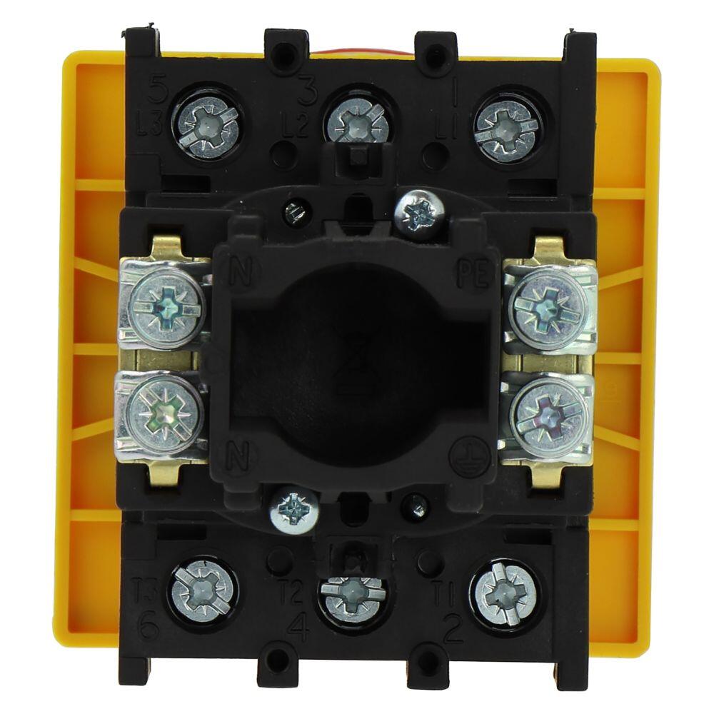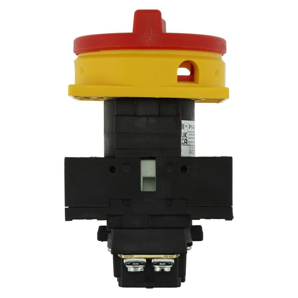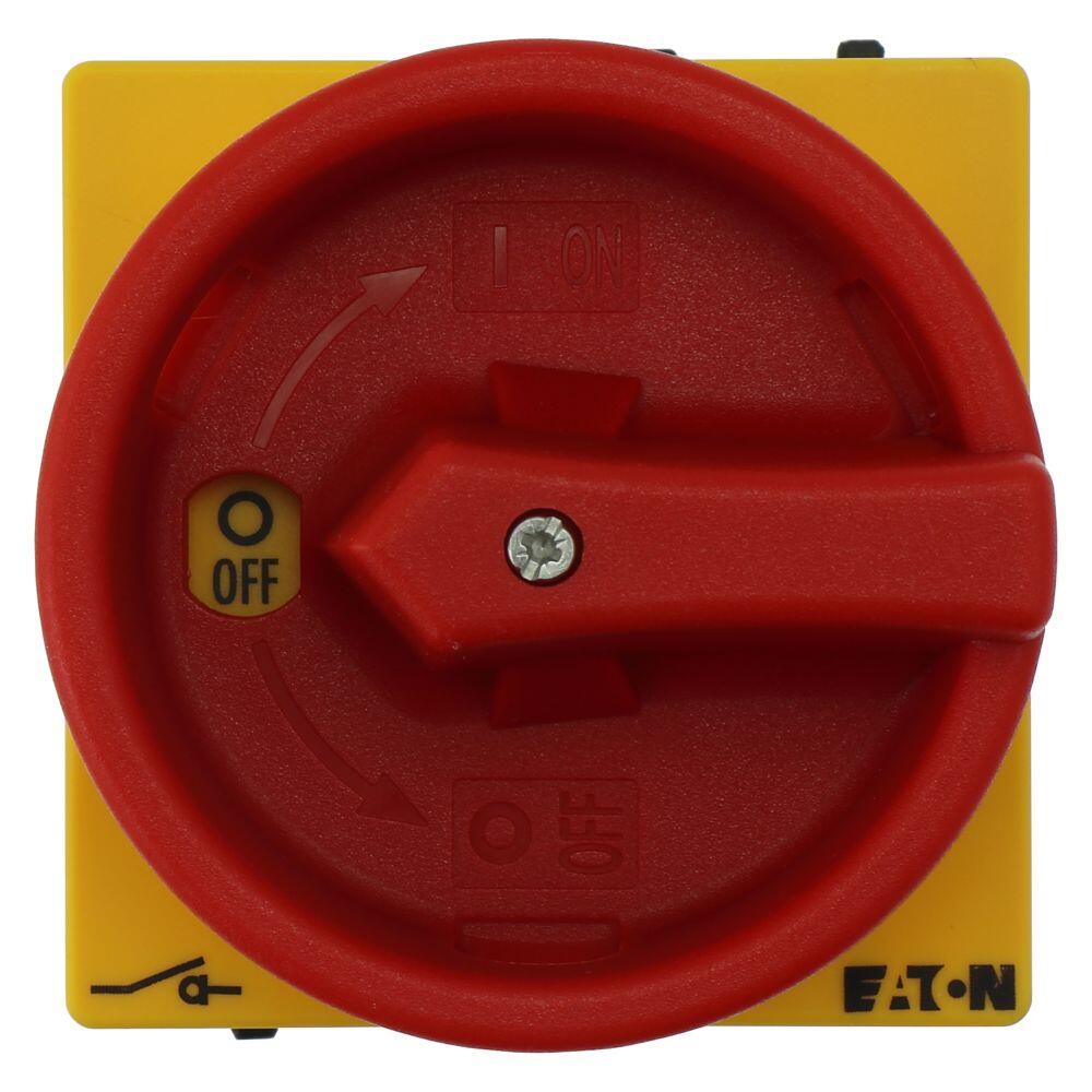 Главный выключатель Eaton Moeller® серии P1, 40 А, 3-полюсный, с функцией аварийного отключения, встраиваемый, с красной рукояткой и жёлтым фиксирующим кольцом.