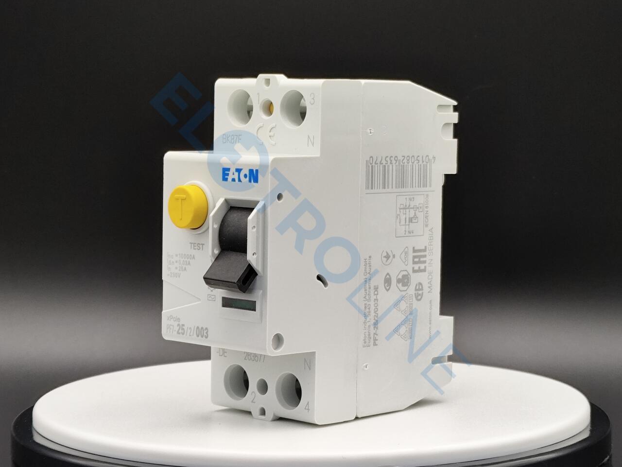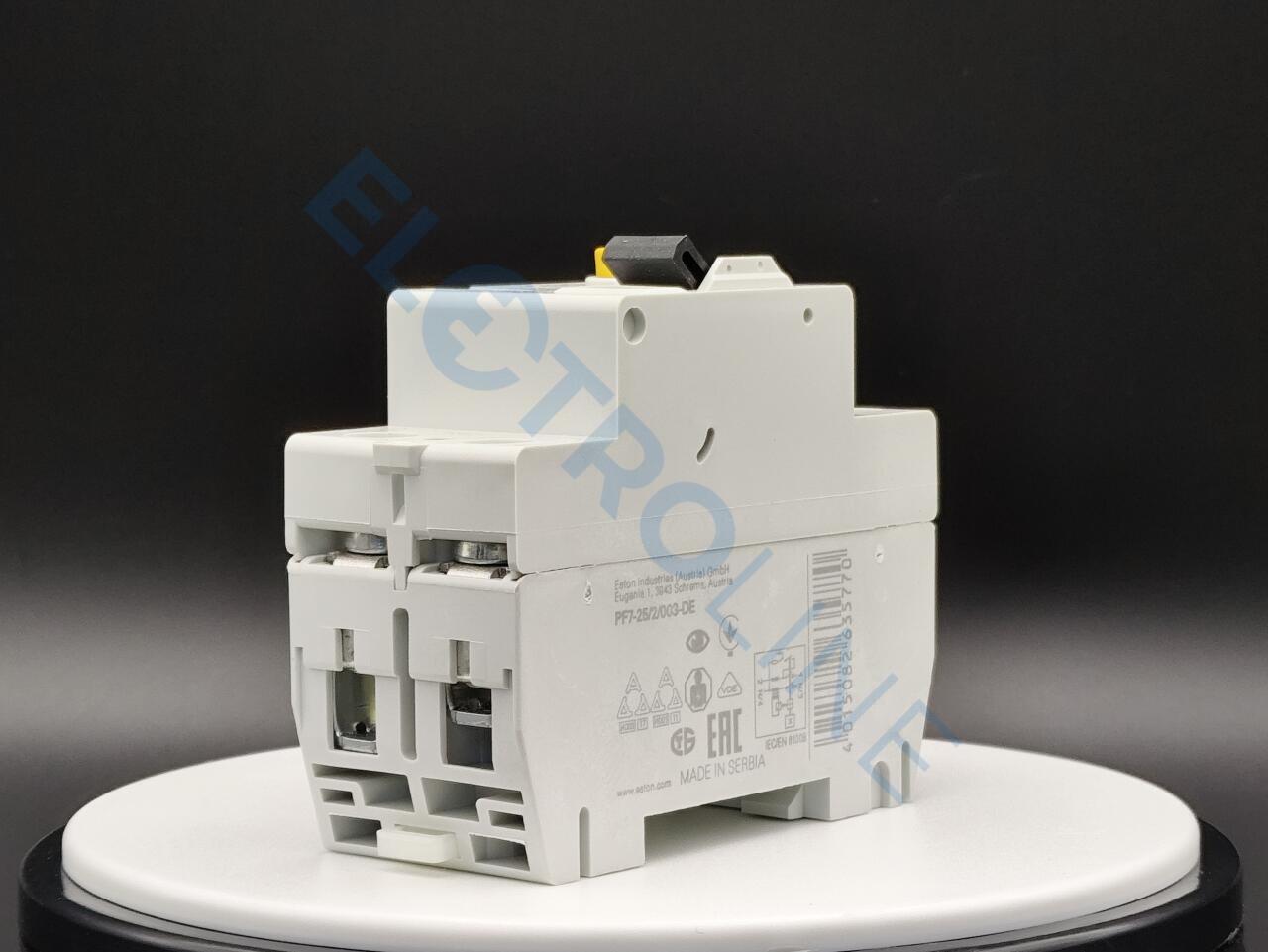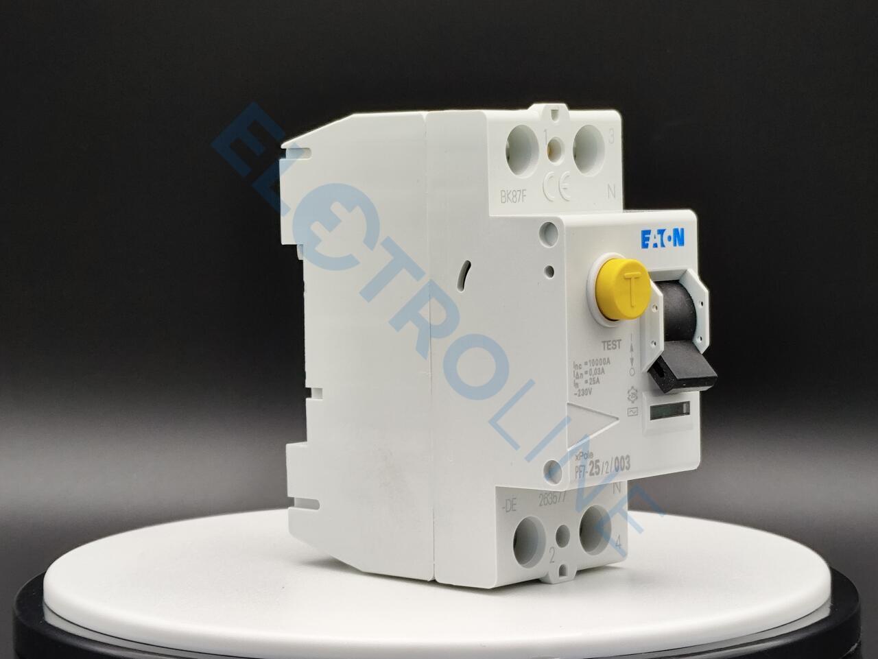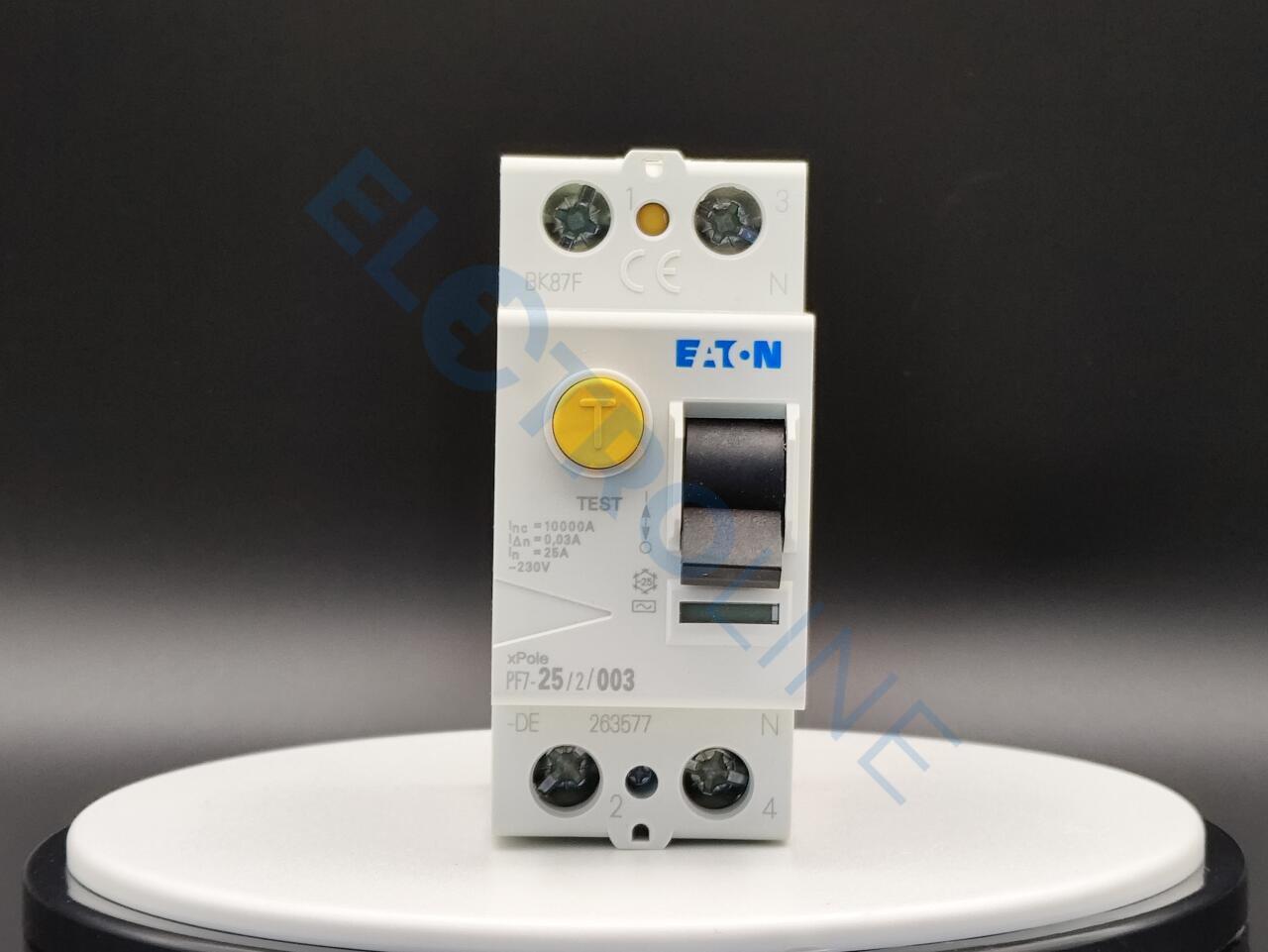 PF7-25/2/003-DE – это устройство защитного отключения или сокращенно УЗО. Разработано и создано брендом Eaton. Иными словами – это механический коммутационный прибор, который предназначен для автоматического разъединения цепи от питающей сети в случае повышения тока небаланса определенного значения. Такое устройство способно защитить человека от поражения электрическим током. Устройство PF7-25/2/003-DE выполнено из высококачественных материалов, благодаря чему отличается высоким уровнем прочности и надежности. Модель имеет два полюса и рассчитана на работу с электросетью 25 А. УЗО устойчиво к импульсному току 250 А.