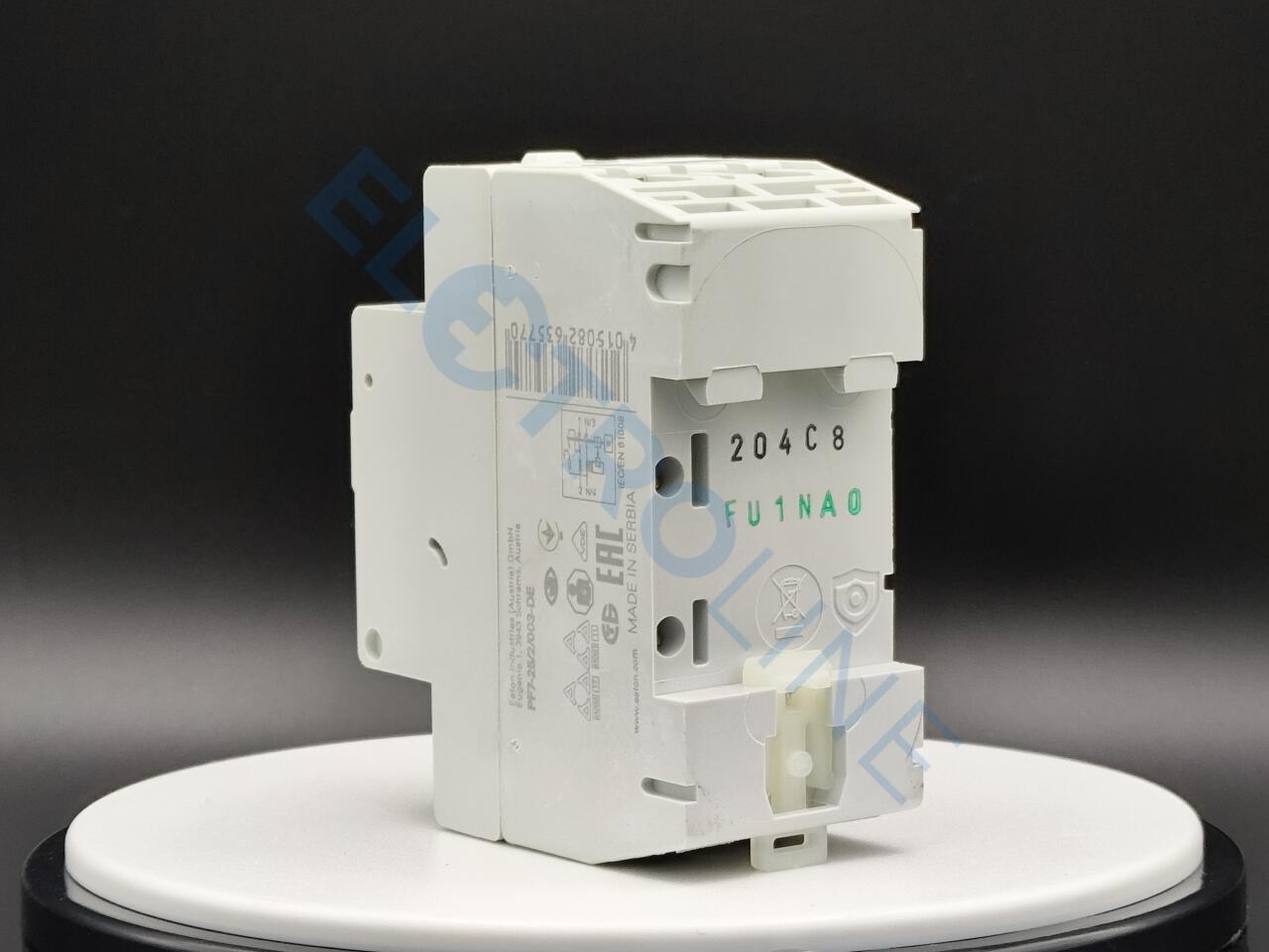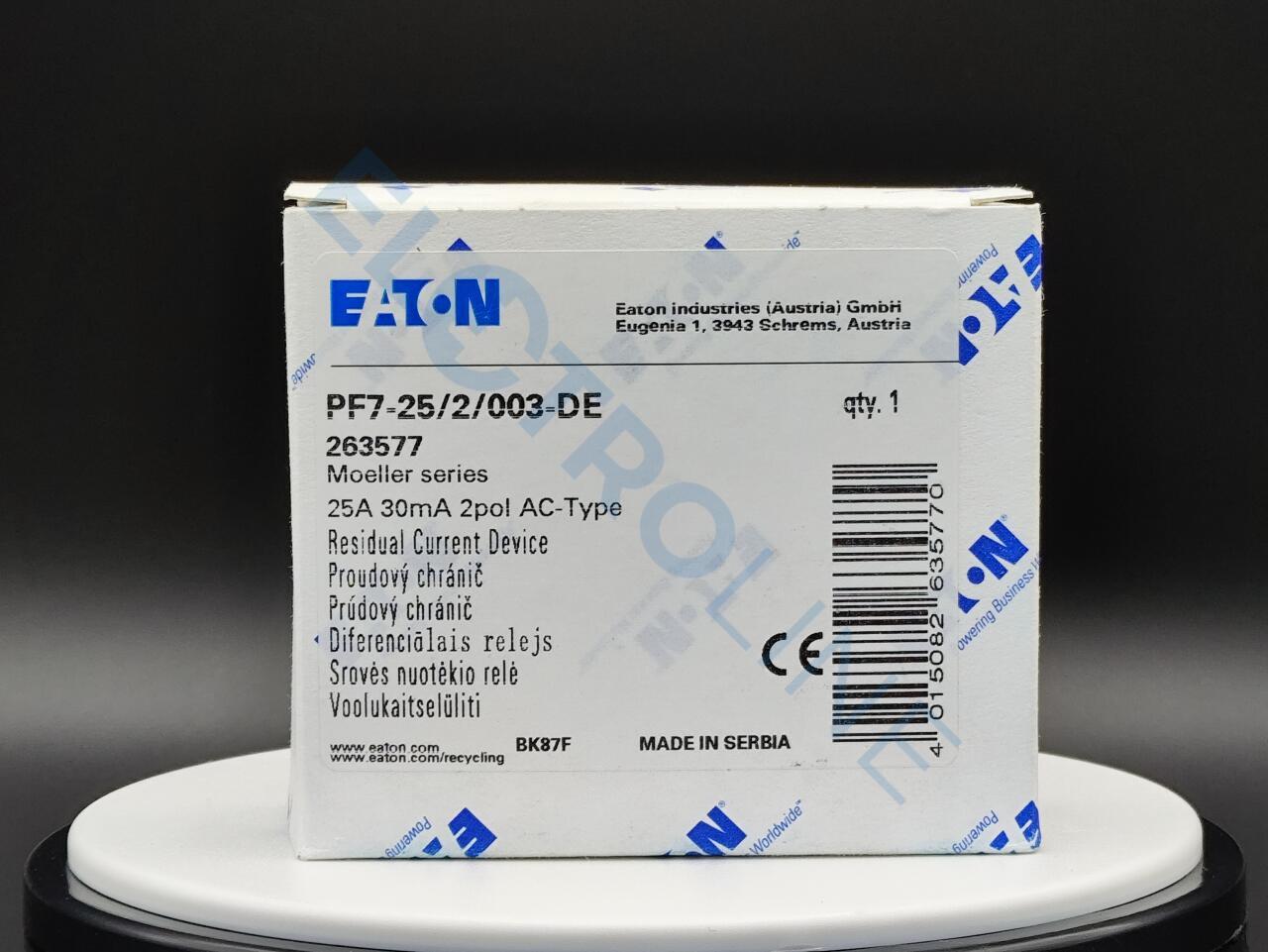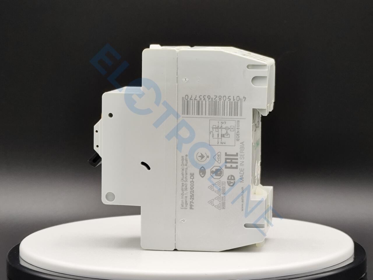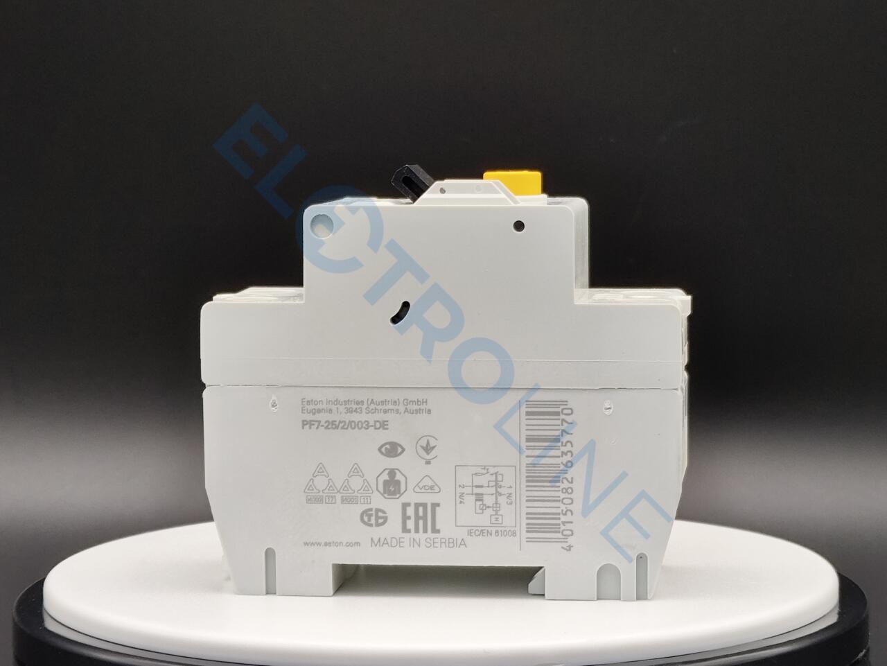 PF7-25/2/003-DE – это устройство защитного отключения или сокращенно УЗО. Разработано и создано брендом Eaton. Иными словами – это механический коммутационный прибор, который предназначен для автоматического разъединения цепи от питающей сети в случае повышения тока небаланса определенного значения. Такое устройство способно защитить человека от поражения электрическим током. Устройство PF7-25/2/003-DE выполнено из высококачественных материалов, благодаря чему отличается высоким уровнем прочности и надежности. Модель имеет два полюса и рассчитана на работу с электросетью 25 А. УЗО устойчиво к импульсному току 250 А.