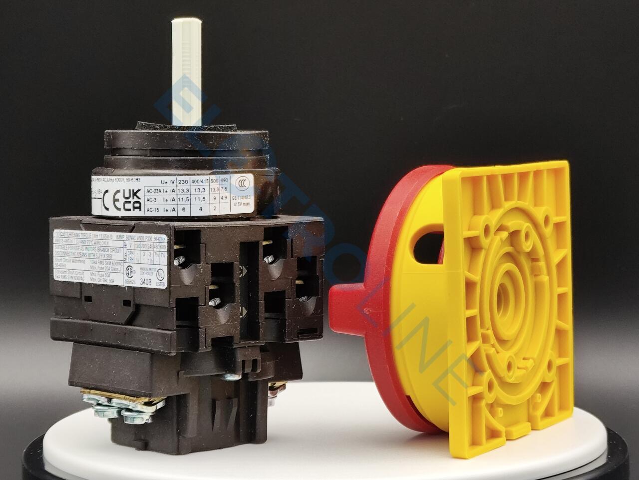 Главный выключатель, Ассортимент: Главные выключатели, Сервисные выключатели, Ремонтные выключатели, Идентификатор типа: T0, Функция останова: Функция аварийного выключения, с красной поворотной ручкой и с желтым храповым венцом, 3-полюсн. + N, Возможность блокировки: запираемый в положении 0, Класс защиты: спереди IP65, Конструктивное исполнение: Монтаж, Угол включения: 90 °, Расчетная эксплуатационная мощность AC-23A, 50 - 60 Гц 400 В: P = 5.5 кВт, измеренный ток длительной нагрузки: Iu = 20 A, 2 Модуль (модули), Стандарты и предписания: IEC/EN 60947, VDE 0660, IEC/EN 60204, CSA, UL, Силовые разъединители согласно IEC/EN 60947-3
