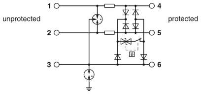 Устройство защиты от перенапряжений (защитный штекер и базовый элемент) со встроенным индикатором состояния для трех сигнальных проводников с общим опорным потенциалом. Для высокочастотных приложений и телекоммуникационных интерфейсов без напряжения питания. Непрямое заземление через газовый разрядник.