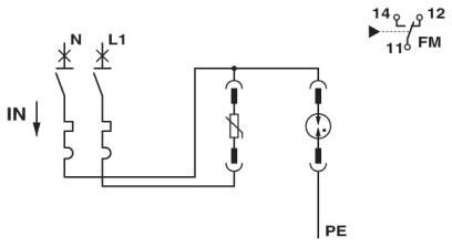 Комбинация из УЗИП класса II и входного предохранителя, с контролем разрядника и предохранителя, с контактом для дистанционной индикации. Исполнение: 3-проводные системы (L1, N, PE), монтаж на рейку NS 35